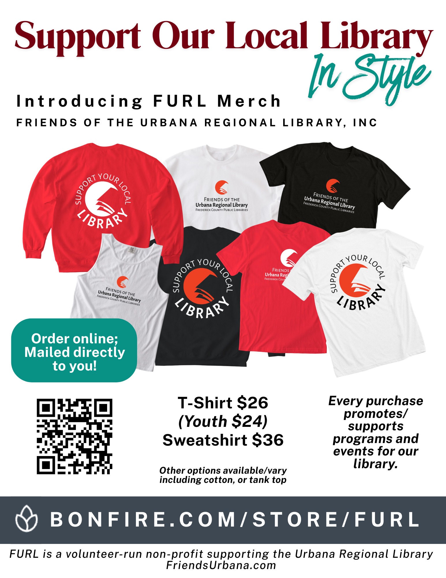 FURL shirts and sweatshirts are now available, offering a simple way to support the Urbana Regional Library beyond our book sales!